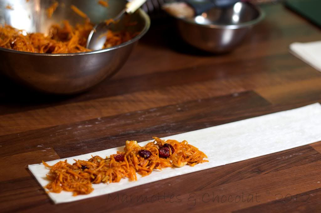 de longs rouleaux, farcis au potiron, noix, sucre et cannelle.